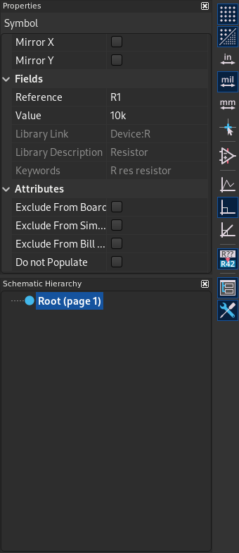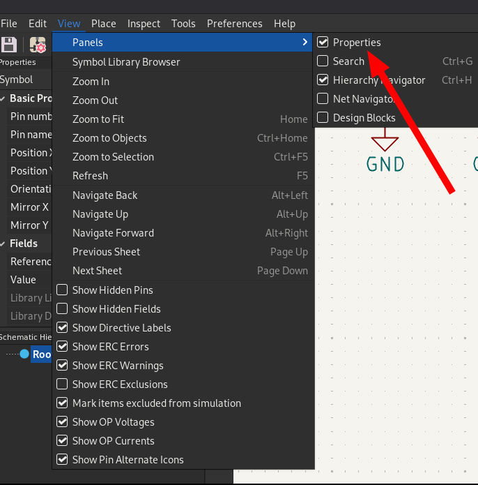 - Open the Properties panel (in newer KiCad versions, it appears on the left side of the workspace)